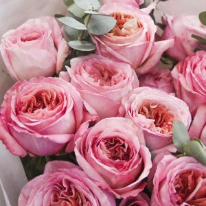 Большой букет из 25 розовых пионовидных роз с эвкалиптом